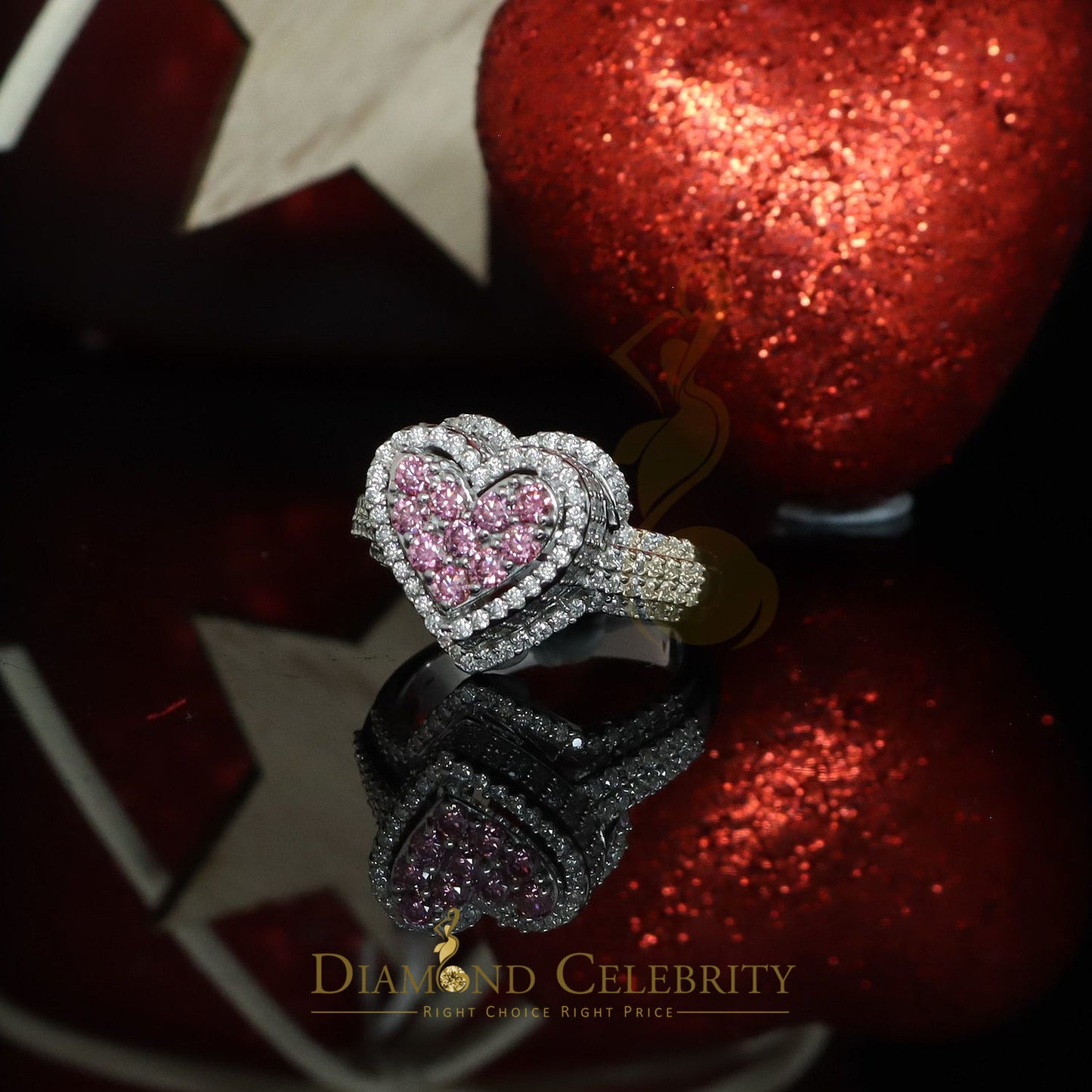 DiamondCelebritees 2.50CT Women's925 Silver White VVS 'D' PINK Moissanite 3D Heart Shape Ring Size7