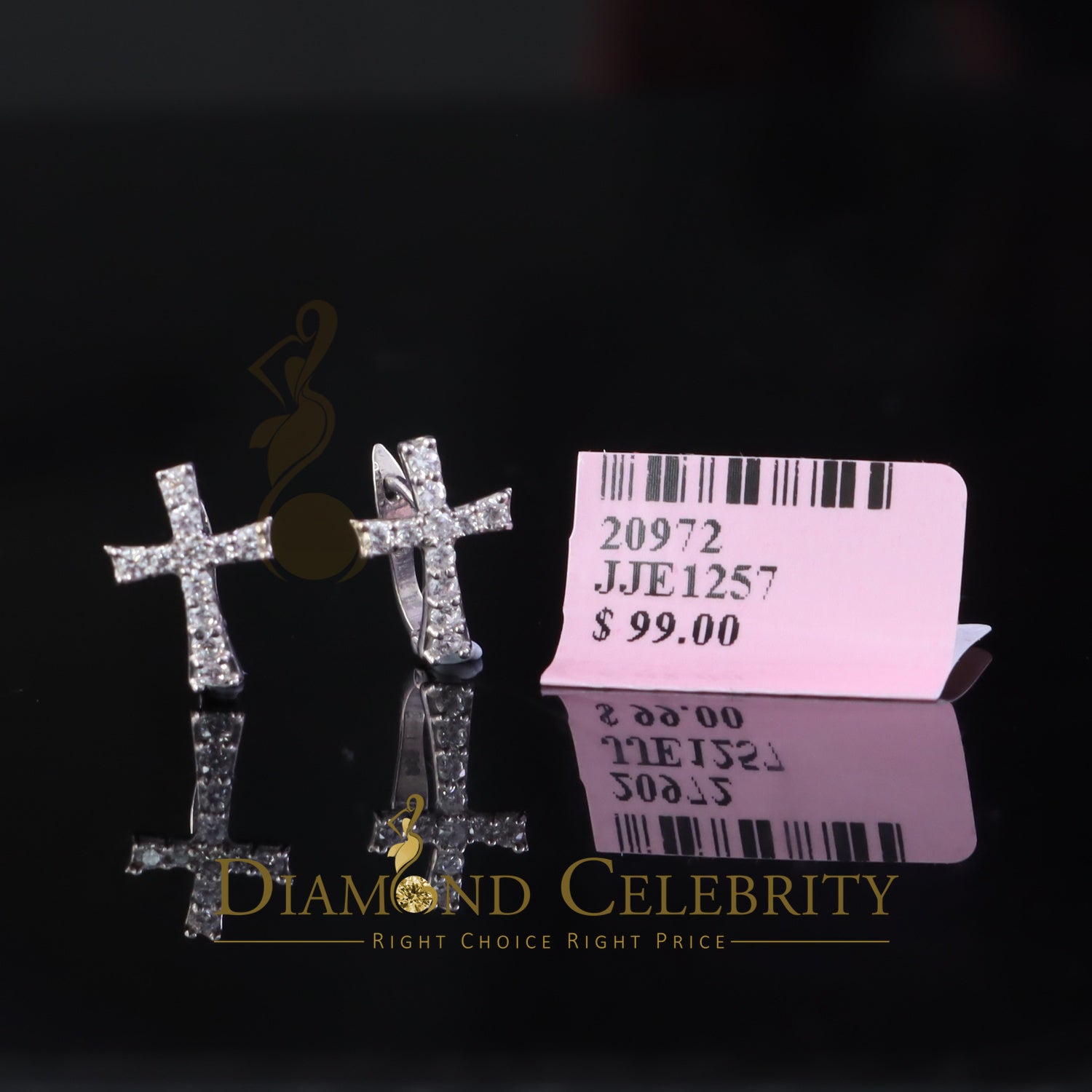 DiamondCelebritees 925 Silver Round Shape White Hip Hop Cross Stud Earrings 22 CZ Stones for Womens